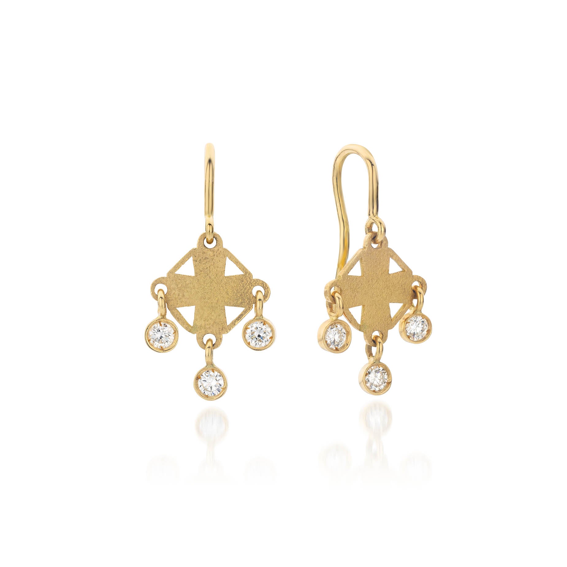Three little droplets dangle from these miniature medallions that exude beauty and simplicity. The Anicia Earrings features 0.18cts of round brilliant cut diamonds. The lightweight craftsmanship allows gentle movement that mesmerises onlookers.