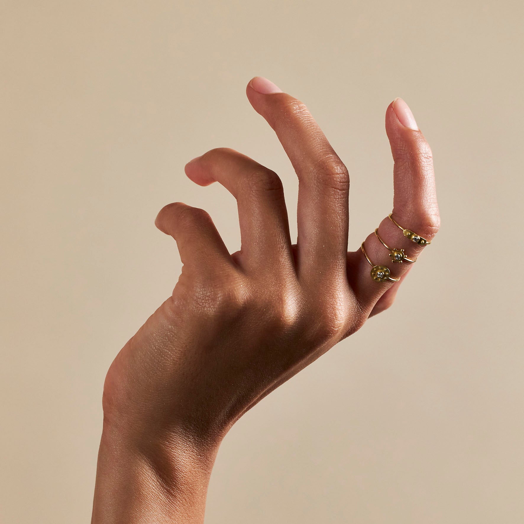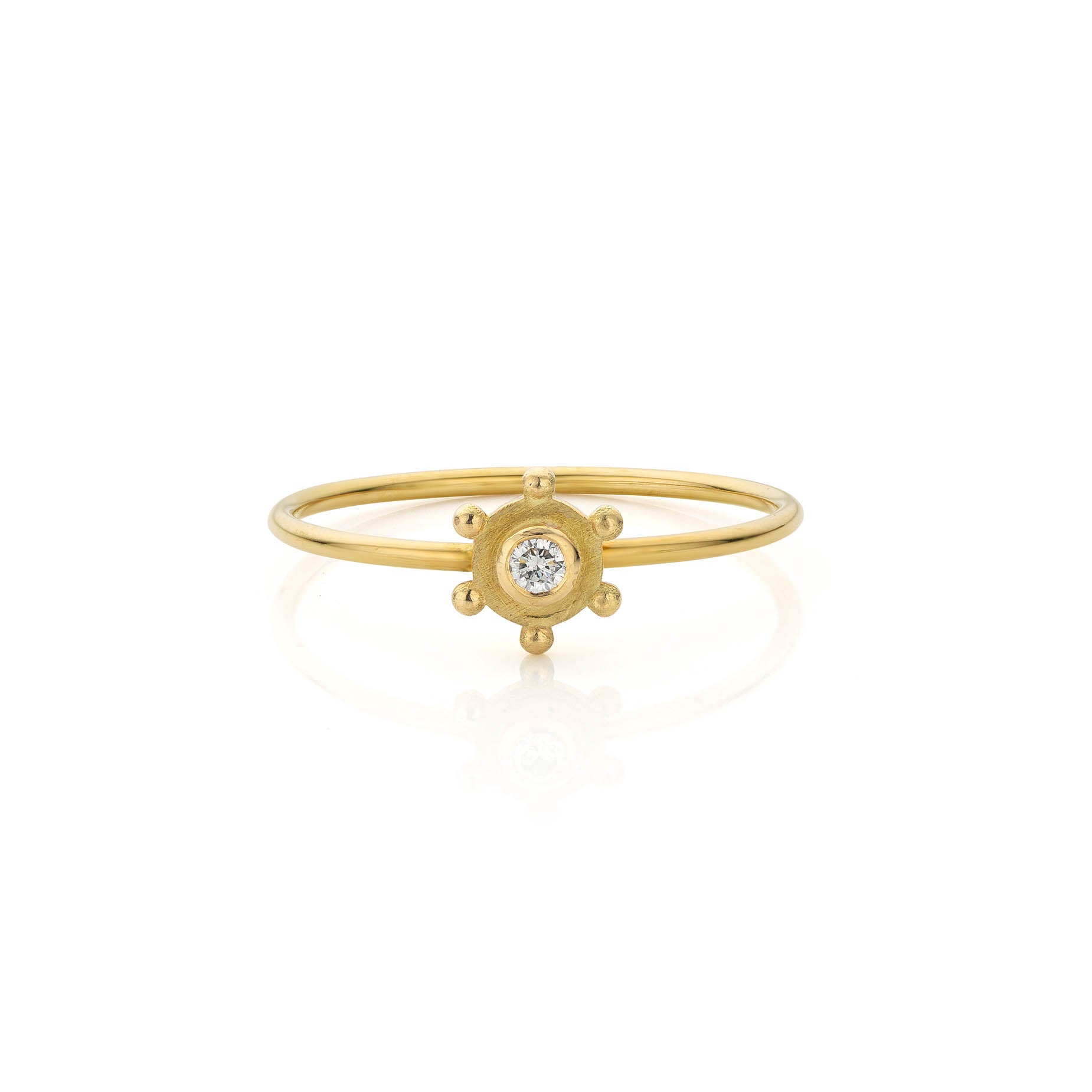 Singular in its craftsmanship using ancient techniques, the Juliana ring captures the warmth of gold and the brilliance of a 0.03ct round brilliant cut diamond. The perfect way to represent the star that you are.