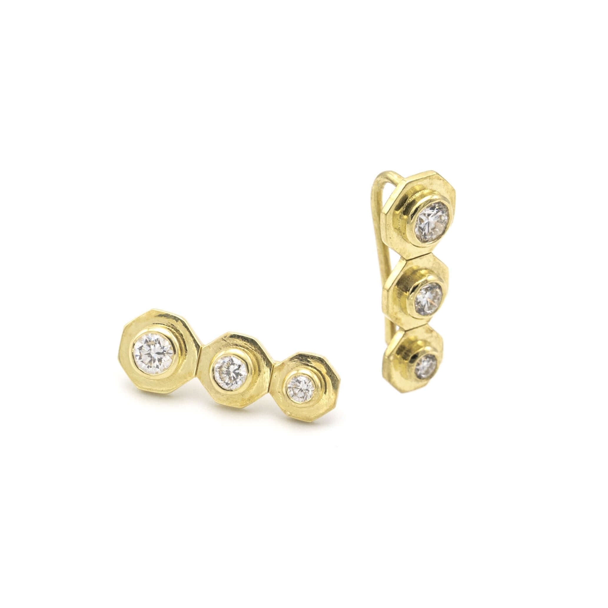The Octagon is a symbol of rebirth and renewal. This structural shape of the Renaissance becomes a frame for the modern diamond. Our climbers feature 0.38cts of round brilliant cut diamonds set against warm yellow gold. Sold as a pair.
