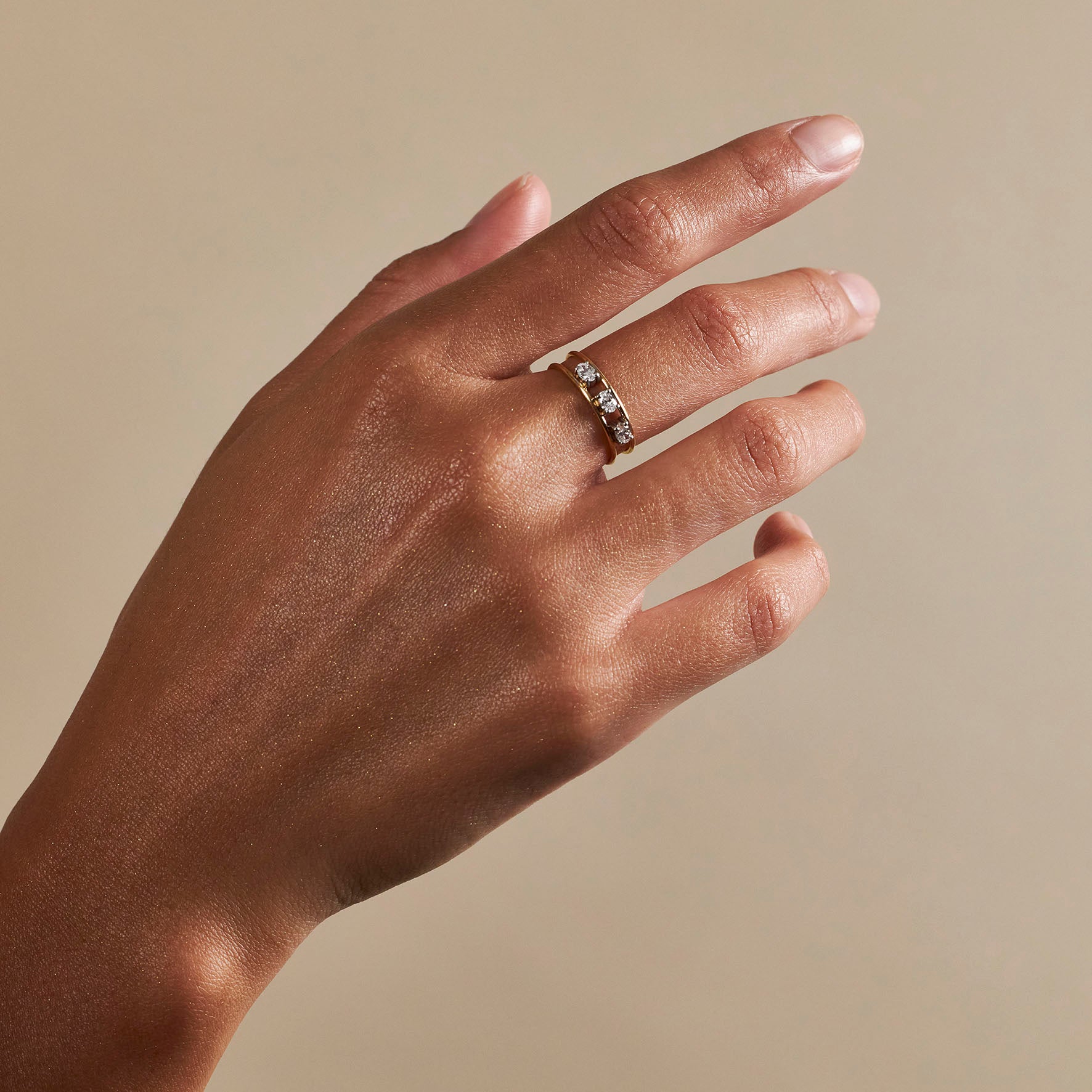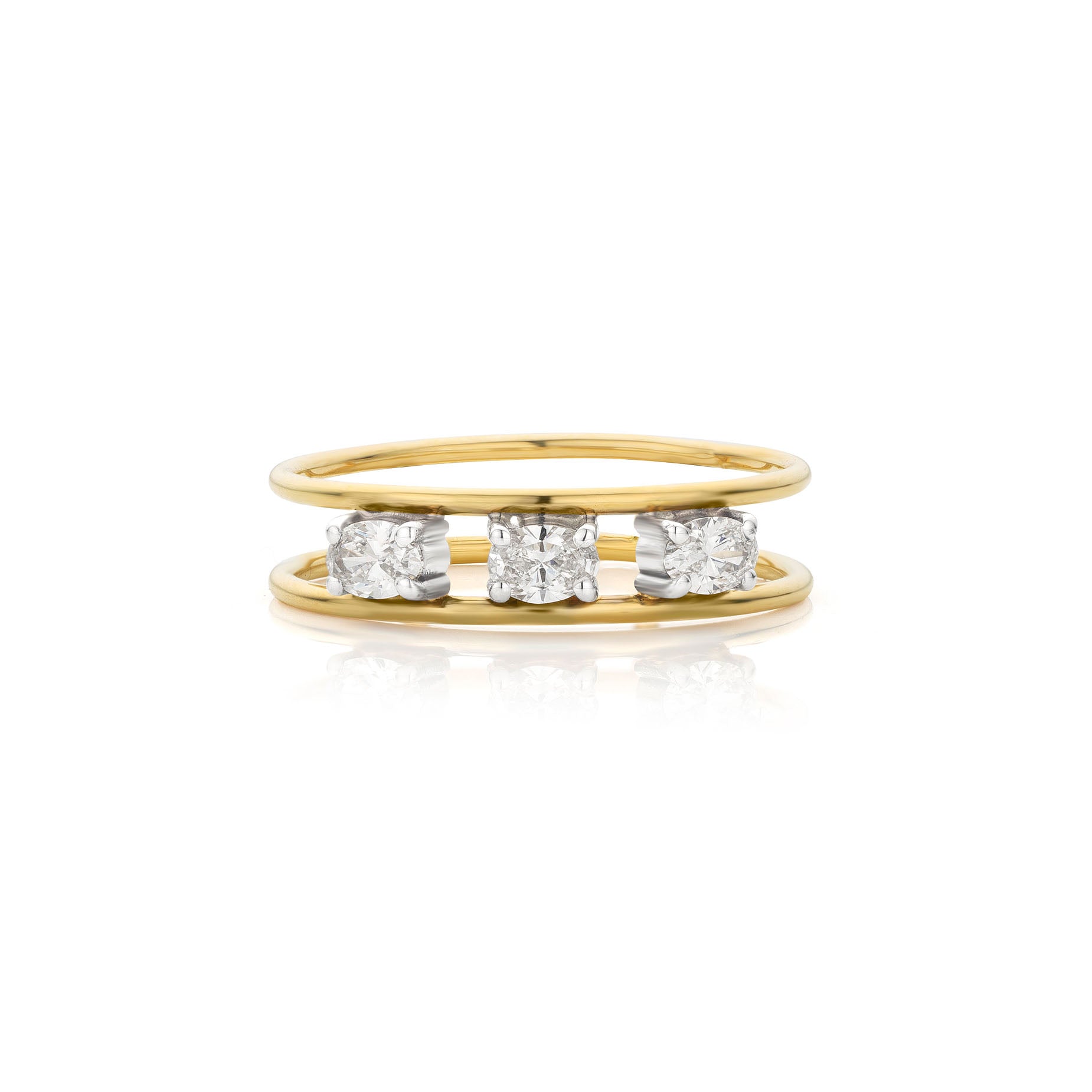 Three diamonds that float between slender bands of gold. Featuring 0.30cts of brilliant cut oval diamonds that are set to capture the light around you. Handcrafted to be feather light, this modern band is as unique as your story.