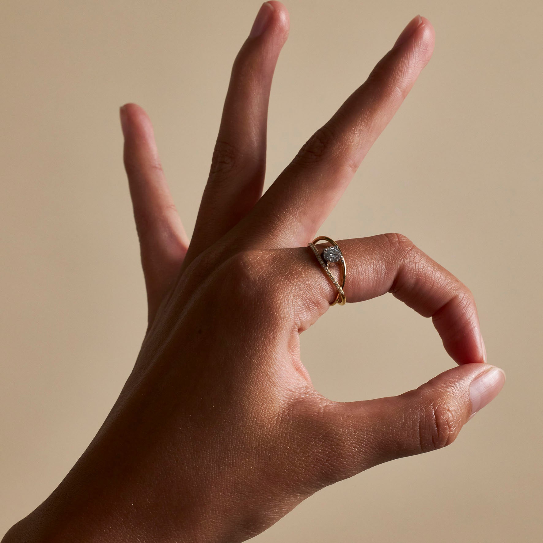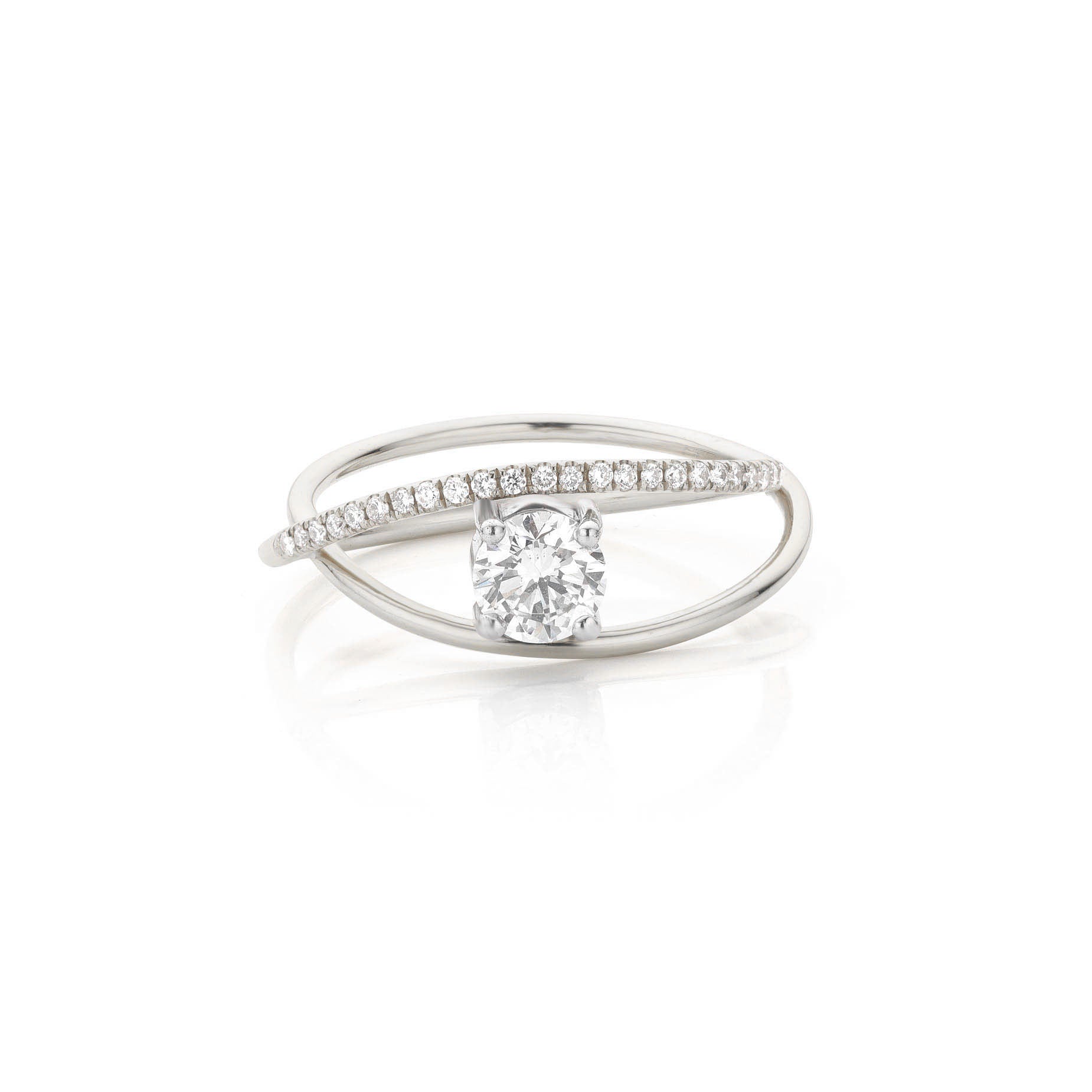 Hovering on one band, firmly joined to the other. Our half carat Round Brilliant Parallax allows your head to be buried in the clouds while your feet are firmly planted on the ground. An expression of colliding dreams and a sense of duty.