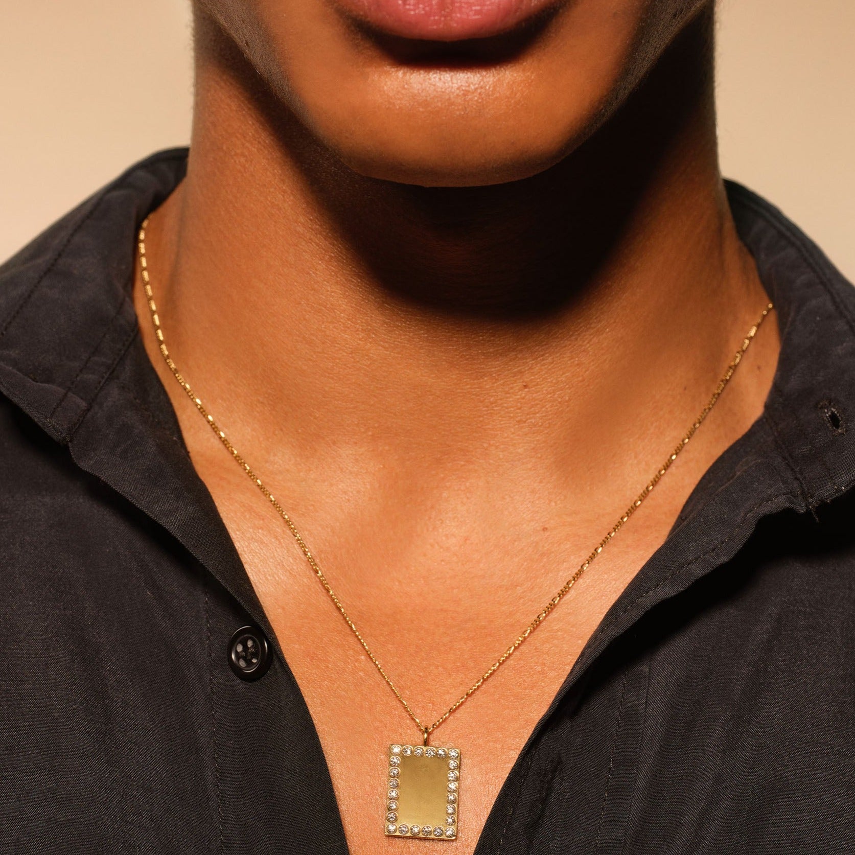 Pierced with 0.72cts of round brilliant cut diamonds, our brushed gold slate will ground you no matter where you are. A fresh modern take on the identity tag with a solid feel that will make you want to wear it forever.