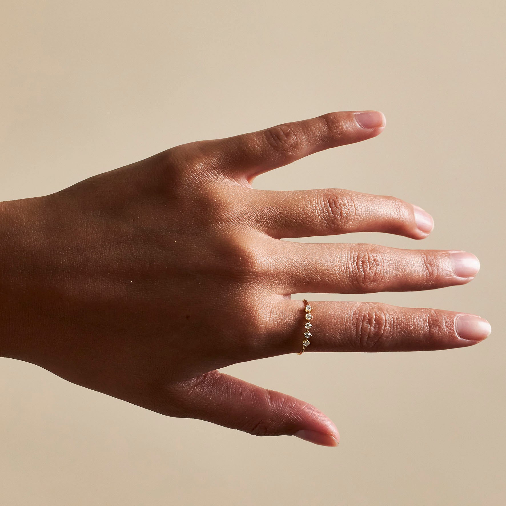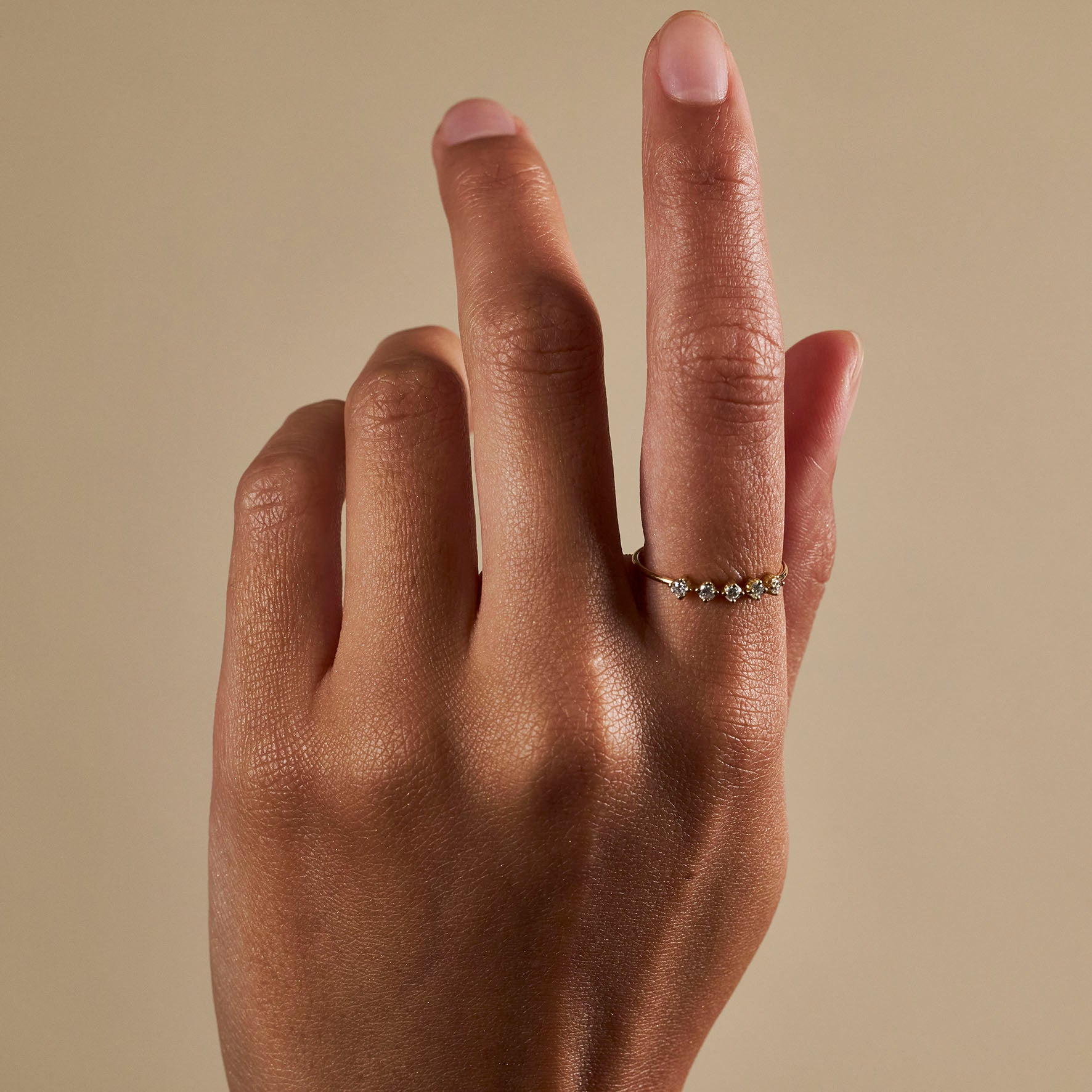Light and energy infinitely reflected off five diamonds that scintillate and mesmerize. This ring will be your favorite for years to come. A must for every jewelry box featuring 0.15cts round brilliant cut diamonds.