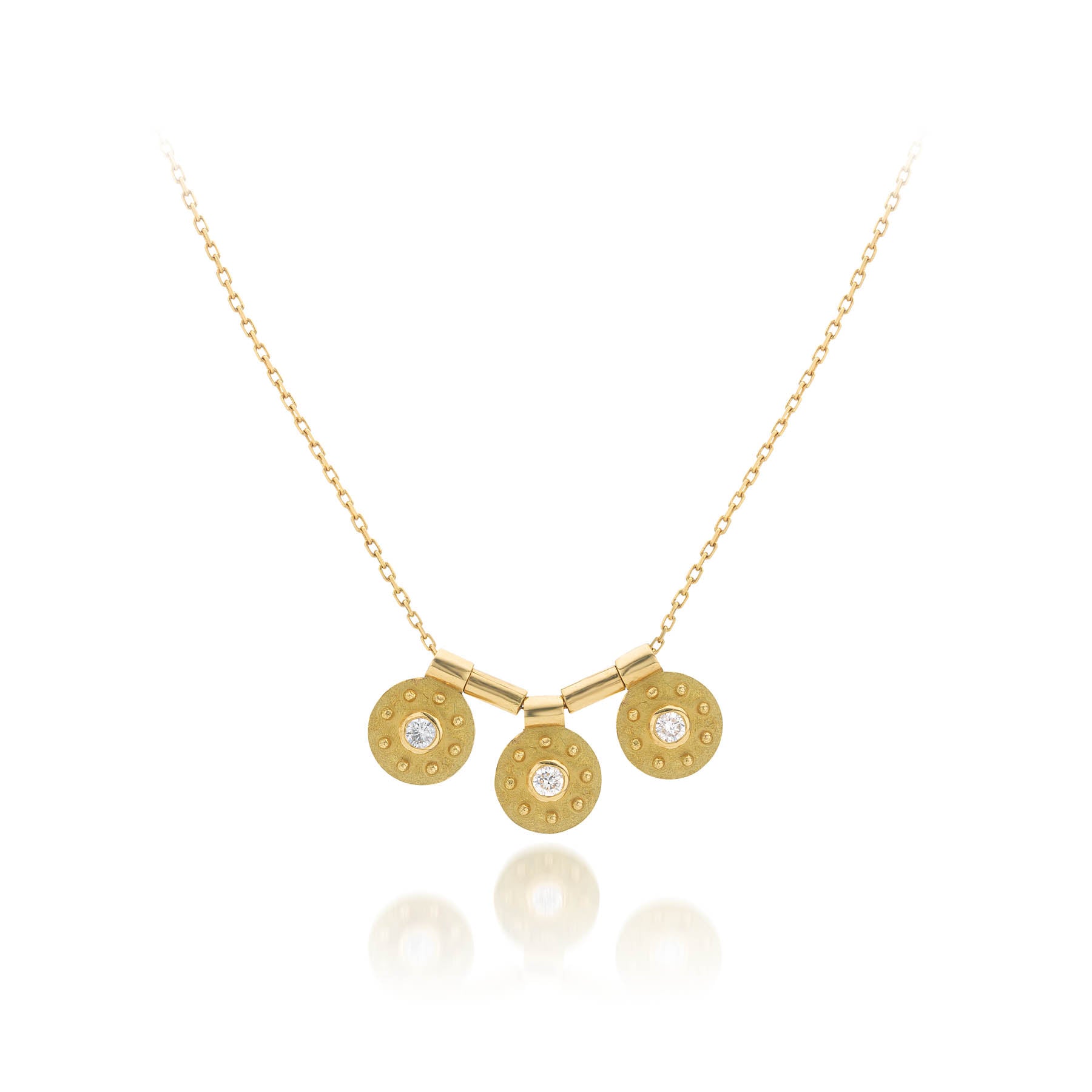 Byzantine craftsmanship meant a special attention to detail. We've taken the traditions of goldsmithery and handmade every bead and charm that rest imperfectly perfect on your neck. Our Zoe Three is strung together with miniature medallions featuring 0.09cts of round brilliant cut diamonds.
